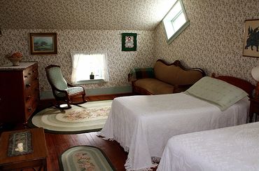 On the northwest end of the second floor, the Green Room has quaint attic windows. This room can be two twin beds or converts to a king size bed. This room can accommodate a roll-away (2 available) or air bed (not provided) for additional guests.