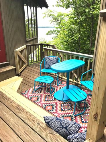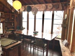 Large dining table flanked by built-in benches. Gorgeous views of summer sunsets & passing boats on the lake below.